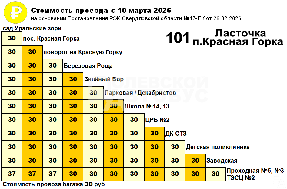 105 «Ласточка - Ст.Полевской», 105/1 «Юг - Ст.Полевской»: Ласточка - п.Ст.Полевской - 63 рубля, Ласточка - сад Кедр - 60 рублей, Юг - п.Ст.Полевской - 33 рубля, Юг - сад Кедр - 30 рублей, п.Ст.Полевской - сад Кедр - 30 рублей, провоз багажа - 30 рублей;