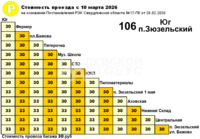 106 «Юг - Зюзельский» проезд 30 - 33 рубля, провоз багажа - 30 рублей.