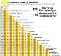 Полевской Юг - Екатеринбург - 173 рубля, Ласточка - Екатеринбург - 147 рублей.